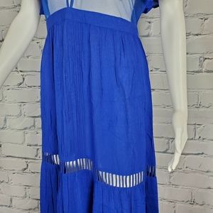 The Daphne maxi dress from Cleobella is a great boho, summer dress or swimsuit cover. It has a sheer mesh bust with floral embroidery. It has sheer ladder stitch at the skirt a s lace hem. It has a slit open back with a zipper and hook and eye closure. It is in good used condition.