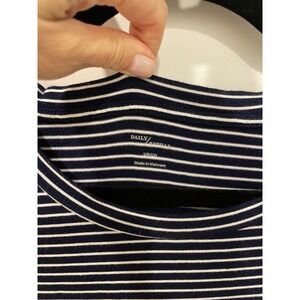 Elevate your wardrobe with this stylish and comfortable tunic top from Daily Ritual. This navy and white striped blouse features a relaxed fit, short sleeves, and a crew neck that flatters any figure. The pullover closure makes it easy to wear, while the polyester blend material ensures durability and comfort. Perfect for any occasion, this tunic top is a versatile addition to any wardrobe. The size small fits true to size, making it an excellent choice for any woman looking for a comfortable and stylish top. Add this Daily Ritual tunic top to your collection today and enjoy the compliments that come your way. This blouse is worn well with leggings. The back of the blouse is longer than the front, so it covers the bottom well. Perfect for travel...takes up not room in the suitcase and is wrinkle-resistant!