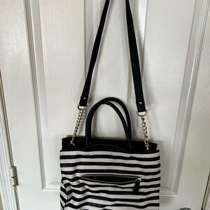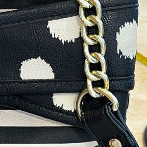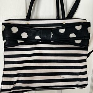 Chic shoulder bag with bold stripes and polka dot bow. Elegant design for versatile style.
