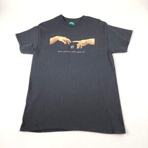 @all black graphic tee featuring a modern parody of Michelangelo’s Creation of Adam with “Human Connection Loading” text and loading icon. Minimalist, ironic design with digital-culture humor—easy casual or streetwear add-on.
