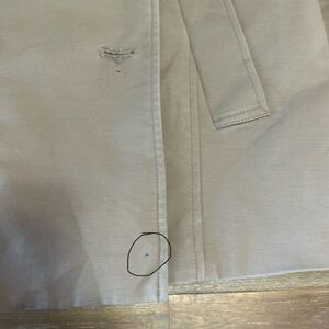 There are a few small flaws. Small mark on the sleeve and bottom front. And one of the button holes is slightly frayed. These are all shown in photos