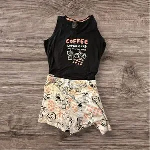 Relax in style with this Coffee Lover Club pajama set. Featuring a black top with a fun coffee-themed print and cream shorts with matching designs, this set is perfect for cozy nights.