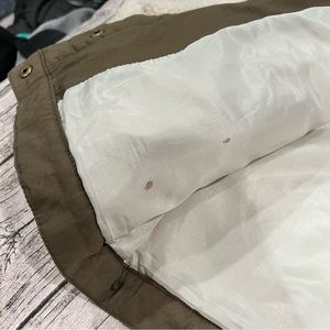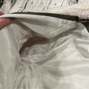 Cozy sherpa jacket with olive accents. Features button closure. Perfect for layering.