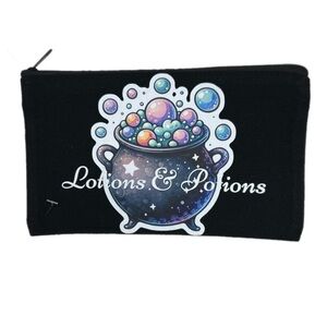 ‘Lotions & Potions’ in White graphic print over cute pastel goth witch bubbling cauldron!