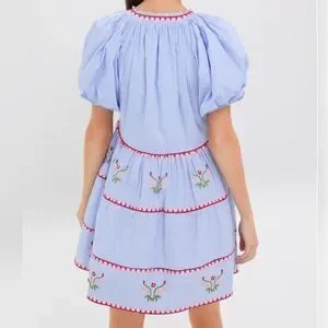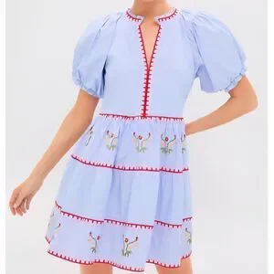 With a mini length, tired skirt, puff sleeve, blue stripes, and embroidered floral detailing, this dress is perfect for picnics, trips to the park, or Al Fresco dining!