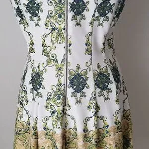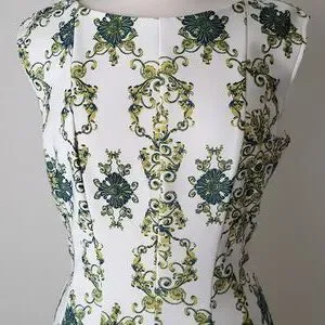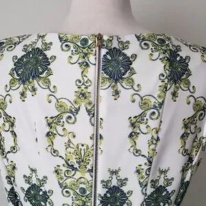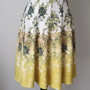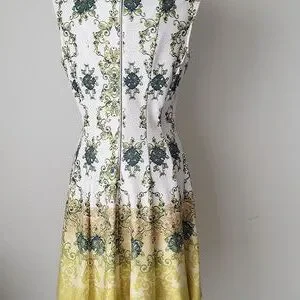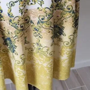 Chic midi dress with intricate green and yellow designs. Perfect for stylish outings.