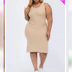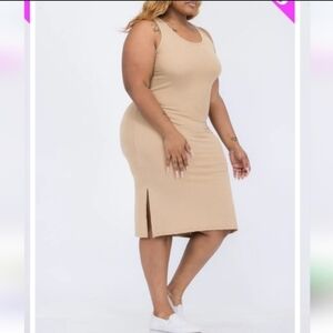 This elegant tan ribbed midi dress offers a flattering fit and timeless style. Perfect for any occasion, it features a subtle side slit for added sophistication. Perfect under a jacket or as a stand alone piece. plus size/curvy