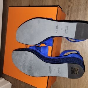 Chic and stylish Bleu espadrilles sandals by Hermes. Perfect for adding a pop of color.