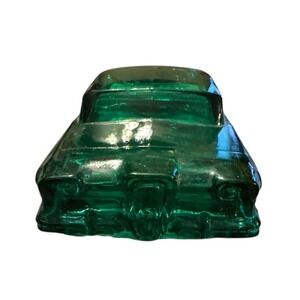 Classic vintage Avon collectible featuring a stylized car-shaped glass bottle in translucent teal. A great display piece for Avon collectors, men's fragrance collectors, or novelty bottle enthusiasts.