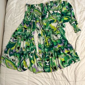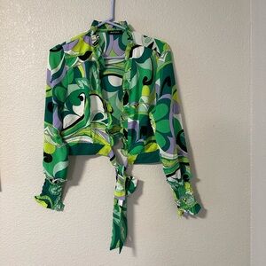 Green multicolor abstract floral set with a long-sleeve wrap-style top and matching high-waisted pleated pants. Lightweight, flowy, and comfortable. Gently used. Great condition. Size M