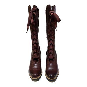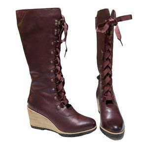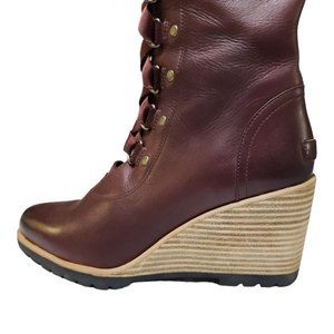 Step out in style with these elegant Red/brownish burgandy lace-up wedge boots. Perfect for any occasion, these boots offer both comfort and fashion.