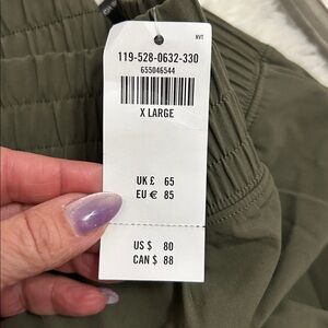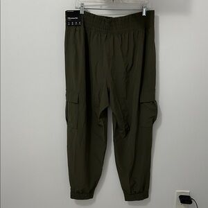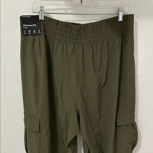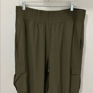 Lightweight stretchy material. Breathable and sweat wicking. Elastic smocked waistband. Cargo leg pockets. Hand pockets. NWT