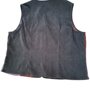 Vibrant patchwork vest with button closure. Features red, purple, and black panels.