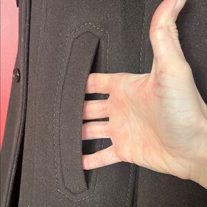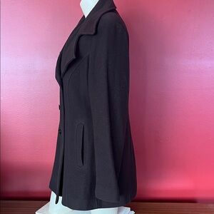 Chic brown pea coat with double-breasted design. Ideal for versatile styling. This can be worn open or up tight to your neck as shown in the pictures. This is fully lined. Approximate measurements are 21 inches pit to pit and 31 1/2 inches from shoulder to bottom of coat. As always, smoke and pet free home. Same day shipping! Willing to negotiate prices.
