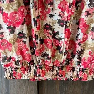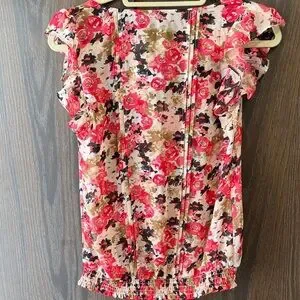 Lightweight floral blouse with ruffle accents. Super cute pink, black, and brown pattern. New with tags and comes with extra covered button. Versatile fairy babydoll delicate. Size small