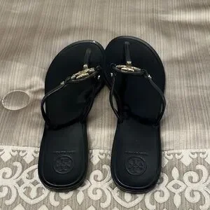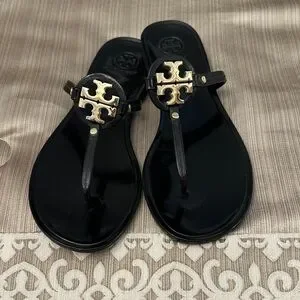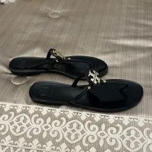 Elegant black sandals featuring a striking gold emblem. Ideal for any occasion.