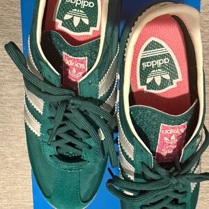 Stylish Adidas sneakers in green and white. Perfect for casual wear. Like new, only used twice, just wasn’t a fan of how skinny looking they are, I like a more chunky platform sneaker. They are super comfy though!