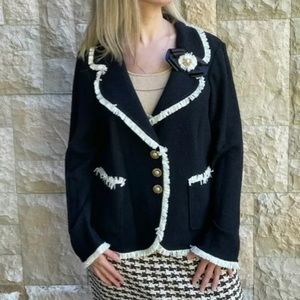 Chic charcoal blazer with ivory fringe. Gold buttons add elegance. Floral embellishment on lapel.