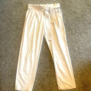 Stylish cream track pants. Features a comfortable waistband and tie belt. Perfect for casual wear.