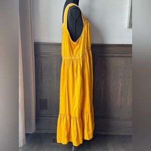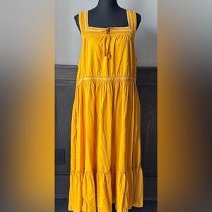 Chic yellow midi dress with square neckline. Features sleeveless design and tiered skirt. Ideal for casual wear.