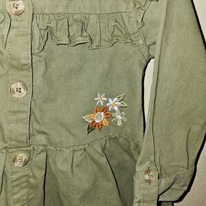 This delightful dress by Little Lass showcases a vibrant green hue with charming ruffles and a mandarin collar. The long cuffed sleeves and floral embroidery enhance its casual elegance, making it a perfect choice for everyday outings.