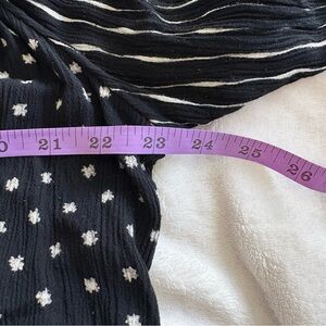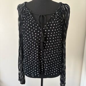 Elegant black blouse with cream patterrn. Features tassel tie detail. Perfect for versatile styling. Can be dressed up or down. A very versatile piece!