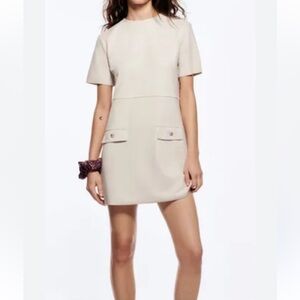 Chic cream mini dress by Zara. Features short sleeves and front pockets. Perfect for versatile styling.