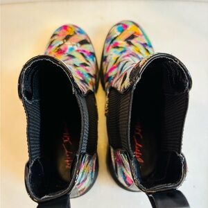 Stylish ankle boots with a vibrant multicolor design. Features a mix of pink, blue, and black.
