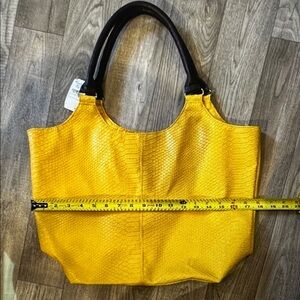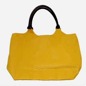 Vibrant yellow tote with a textured reptile skin pattern in faux leather. Stylish and versatile for any occasion. Comfortable dark handles for easy carrying.