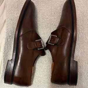 Sophisticated monk strap loafers with silver buckle closure. Premium leather construction, heel recently re-soled. Smooth rounded toe design. Classic dress shoe silhouette.