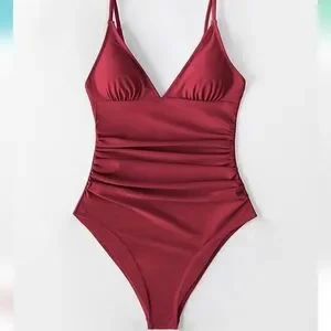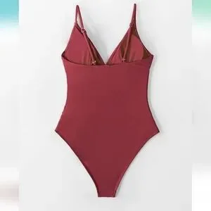 This is a sweet and simple one piece swimsuit. It is sangria colored. It has adjustable spaghetti straps and removable pads. It has ruching on the tummy and hips to add a little flair! The butt looks to have moderate coverage. Perfect for any occasion! New with tags! Feel free to ask any questions!