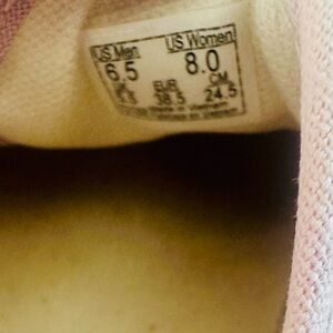 These are in great condition with some scruffs that can be easily cleaned. Women’s size 8 and men’s size 6.5.