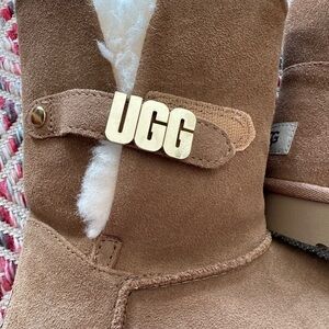 Warm tan UGG boots featuring soft lining and metal logo detail.
