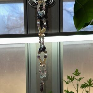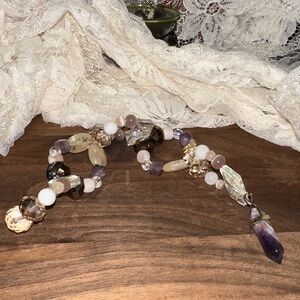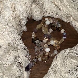 Handmade with Milky Quartz, Dream Amethyst, Lilac Catās Eye, Honey Catās Eye, Yellow Quartz, Matte Flower Agate, Rainbow Mermaid Beads, Blue/ Brown Crystals Beads, Cream Champagne Crystal Beads and Iridescent Diamond Beads.