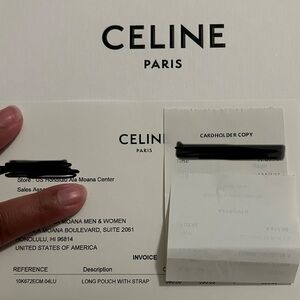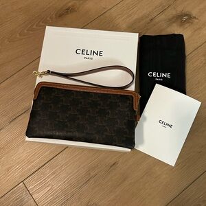 Stylish Celine wristlet with monogram pattern. Brown and tan leather design. Ideal for modern elegance.