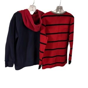 Excellent condition. Boys Ralph Lauren 2 PCS SET. 1- 3 button Henley shirt: Ralph Lauren Rowing Club emblem logo, long sleeves, red with black stripes, 100% cotton. 1-Ralph Lauren Jean co navy with cranberry pullover hoodie. Raised “RL” logo across front, sleeve logo. Size 6. See photos for measurements. MSRP $120