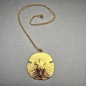 Vintage 12K gold-filled sand dollar pendant necklace featuring a natural shell with a textured finish and five-petal cutout design. Marked 1/20 12kt GF, likely American-made. The 18" gold-filled chain closes with a spring ring clasp. No maker’s mark. Warm patina and bright shine preserved beautifully. A coastal keepsake with timeless beachy charm and symbolic sentiment.