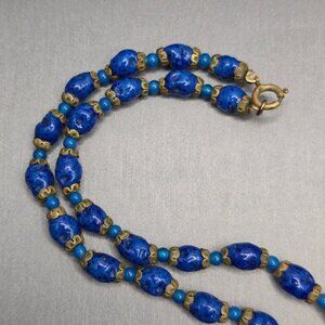 VTG Czech ‘Lapis’ Art Glass Necklace 26" Graduated Nugget Beads Brass Caps 1950s