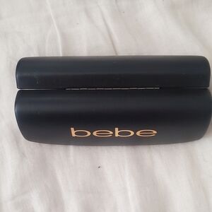 Sleek black sunglasses case with gold Bebe logo. Perfect for stylish eyewear protection.