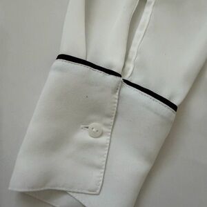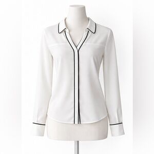 Elegant and versatile white blouse by Dressbarn. Features classic black piping trim along the collar, button placket, and cuffs for a timeless, polished look. Lightweight and flowy fabric—perfect for work, office, or casual chic outfits.