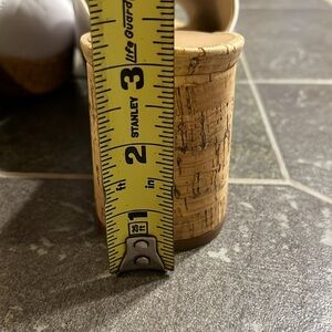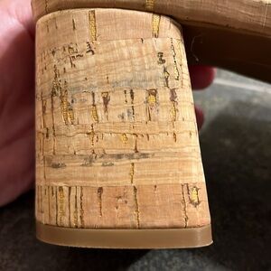 The white leather on these heeled sandals is perfect! The white leather is accented by a cork block and platform. Look at how clean the bottom is. Shoes are in excellent condition!