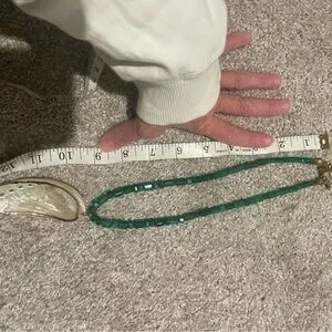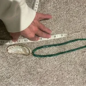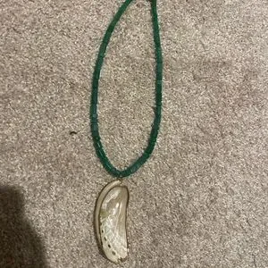 Elegant green beaded necklace featuring a unique shell pendant. Perfect for adding a touch of nature-inspired beauty to any outfit.