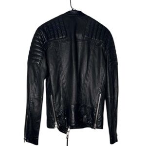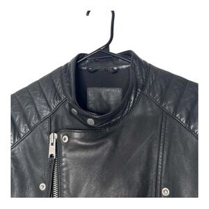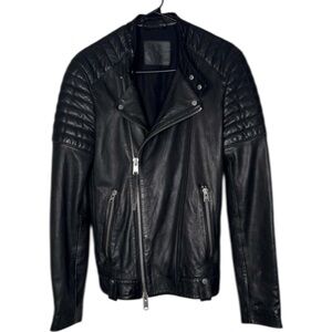 AllSaints Jasper Leather Biker Jacket in black, men's size L. A premium, modern classic featuring signature quilted padding on the shoulders and upper arms.