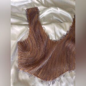 This elegant women's top features intricate beading in a rich brown hue. Perfect for adding a touch of sophistication to any outfit.