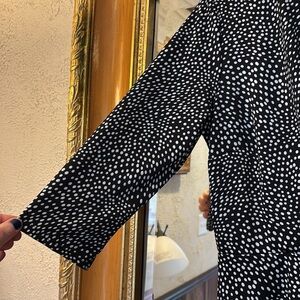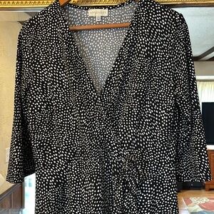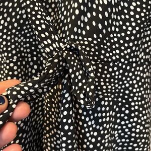 Excellent condition Appleseed’s black and white polka dot faux wrap dress, size PM. 3/4 length sleeves, v-neck, tie on front at waist, ruffle bottom. No rips or stains. Comes from a smoke free home.