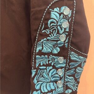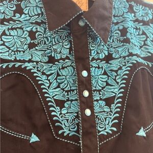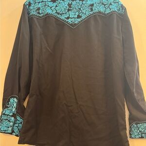 Elegant black shirt with striking turquoise accents. Ideal for a standout style. Western shirt size m with turquoise embroidered front and sleeves with pearl snaps