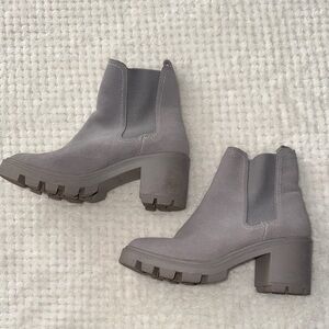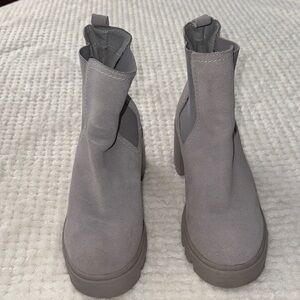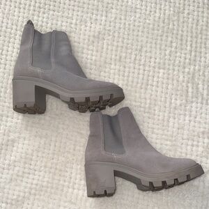 Chic and comfortable Splendid ankle boots featuring a soft gray suede-style upper, elastic side panels, and a trendy lug sole with block heel. Easy pull-on style that works perfectly with jeans, leggings, or dresses.