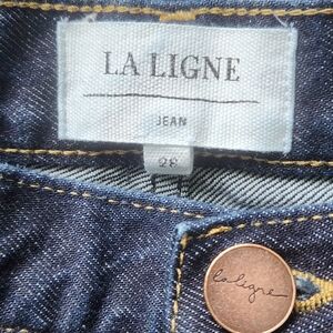 Excellent condition La Ligne jean. I believe the style is 'Marylin' as per the RN # 150209, cropped inseam and wide leg/barrel fit. In excellent condition. Dark wash. The only item to note is the outer patch has a slight discoloration. First 3 images for reference.