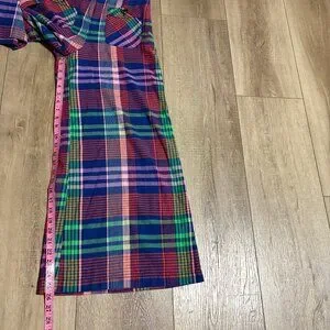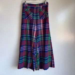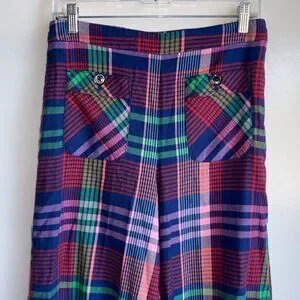 Vibrant plaid pattern. Wide leg design. Stylish and bold.