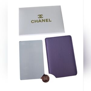Elegant and stylish, this Chanel compact mirror/ card holder in purple is perfect for organizing your essentials. Crafted with precision, it adds a touch of luxury to your everyday accessories.